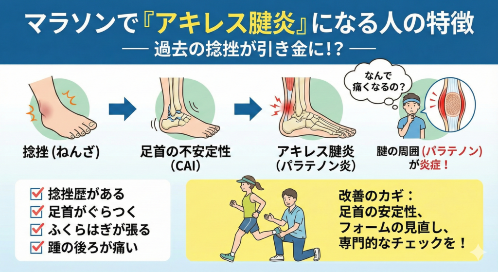 ■ 捻挫後 → 不安定性 → アキレス腱炎の流れ